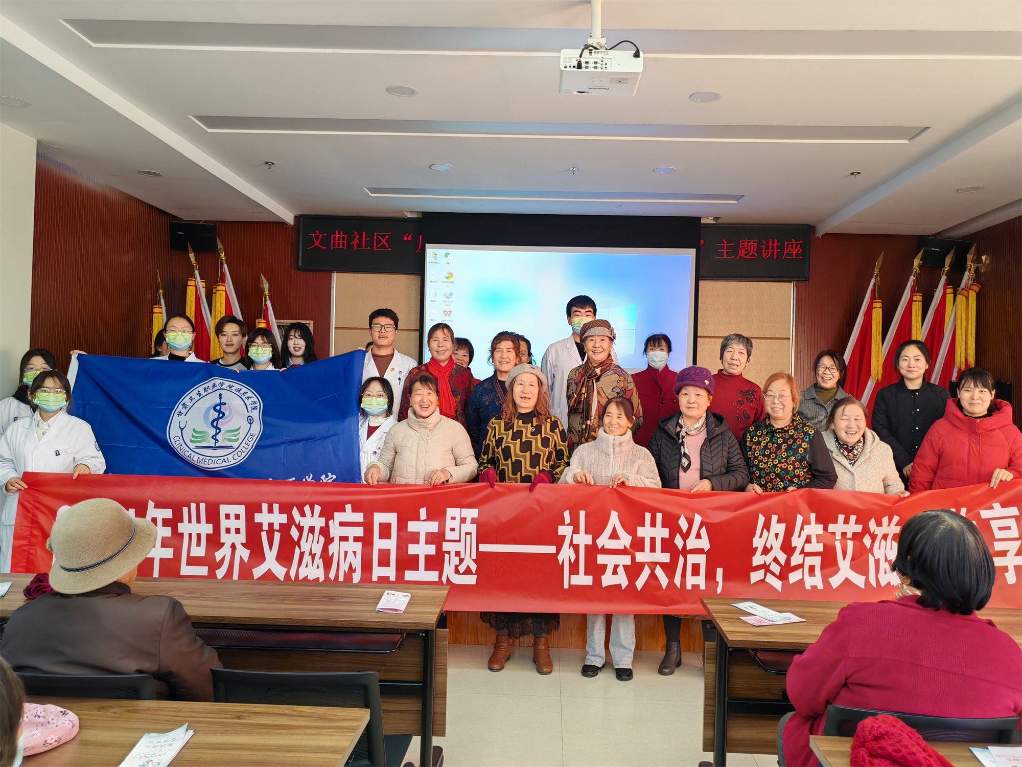 11月28日下午,临床医学院老师带领青囊社的学生走进文曲湖景园住宅小区开展志愿活动。青囊社学生讲解了艾滋病的传播途径、症状表现及防治手段,并分发了宣传手册和防护用品。
