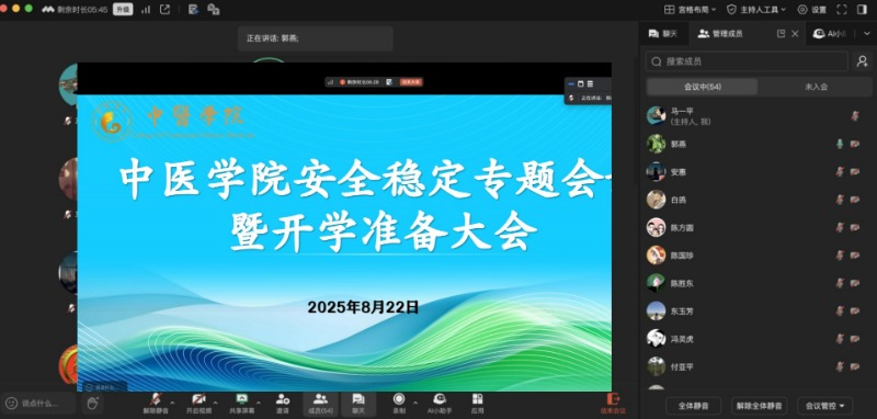 为全面落实学校关于安全稳定与开学筹备的工作要求,确保新学期各项工作平稳有序开展,8月22日晚,中医学院以线上形式召开安全稳定专题会议暨开学准备大会。学院全体教职工50余人参会。会议围绕校园安全稳定及开学筹备工作落实等核心议题展开,明确任务、压实责任,为新学期工作开好局、起好步奠定坚实基础。