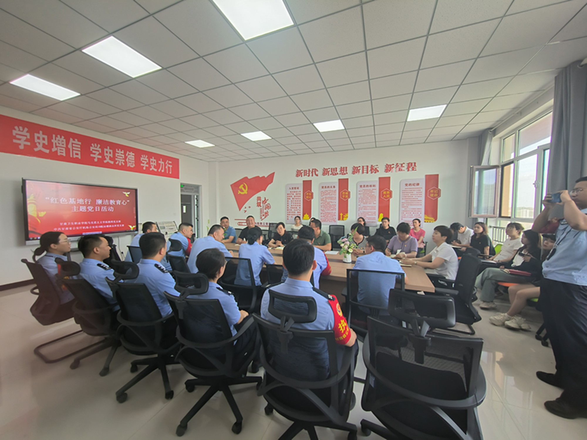 为进一步加强党风廉政建设,严明党的政治纪律和政治规矩,传承红色基因,锤炼党性修养,持续推进廉洁文化建设,6月27日下午,马克思主义学院教师党支部与甘肃省公安厅兰州机场T2航站楼派出所党支部在我校红色文化实践教学基地共同开展“红色基地行 廉洁教育心”的主题党日活动。