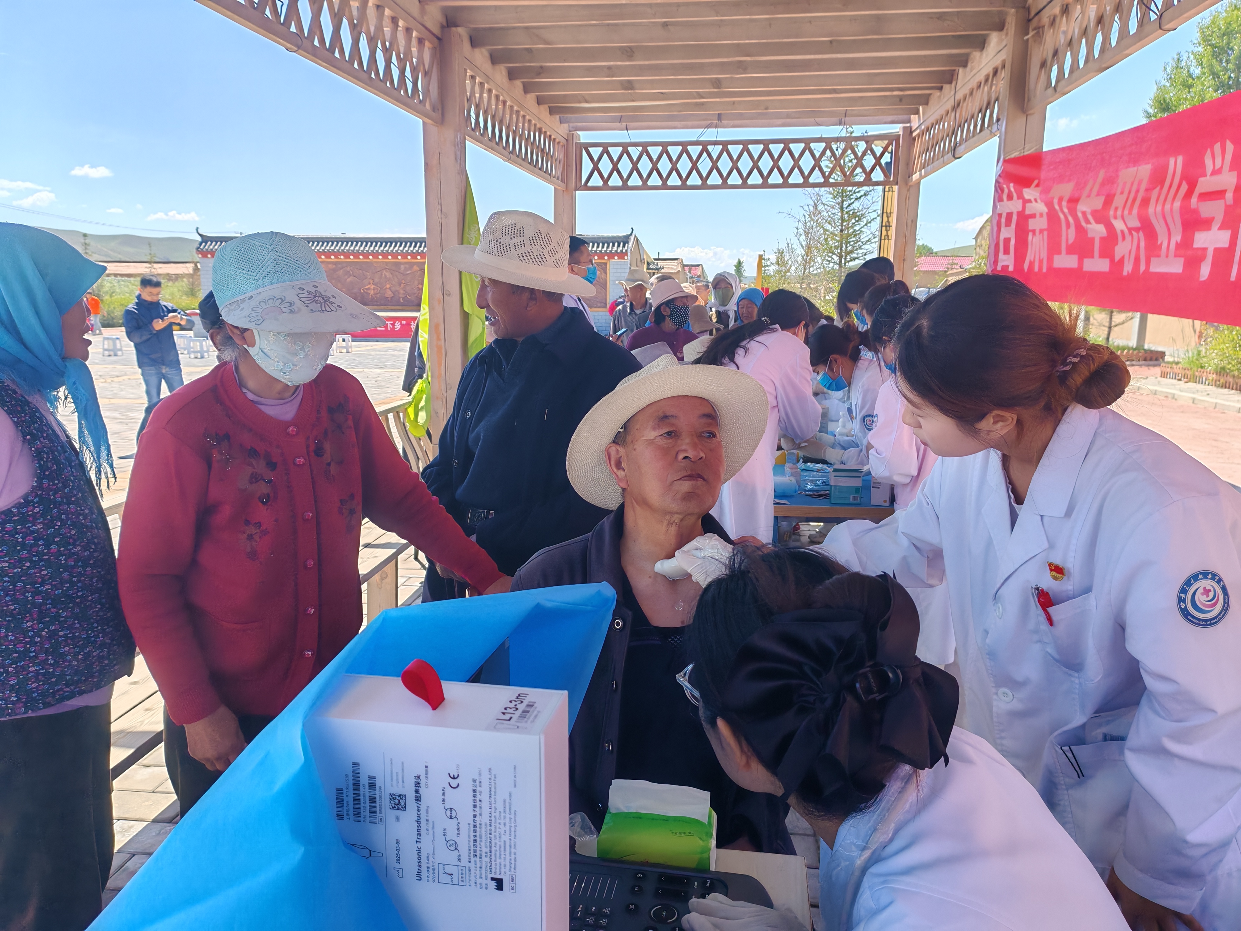 在抓喜秀龙镇炭窑沟村文化广场,义诊活动吸引了众多村民前来。实践团师生发挥医学影像技术、医学检验技术等专业优势,为当地群众提供了甲状腺超声检查以及毛细血管全血血糖检测服务。志愿者们耐心询问村民健康状况,重点针对高血糖及糖尿病风险人群进行早期筛查、健康预警,并给予了个性化的饮食指导建议。部分志愿者还同步开展了预防艾滋病保健知识宣传,并发放了相关防护物资。“这些学生们检查得特别细心,还耐心教会我解读指标,太贴心了!”一位深受感动的藏族阿妈紧握着志愿者的手说道。