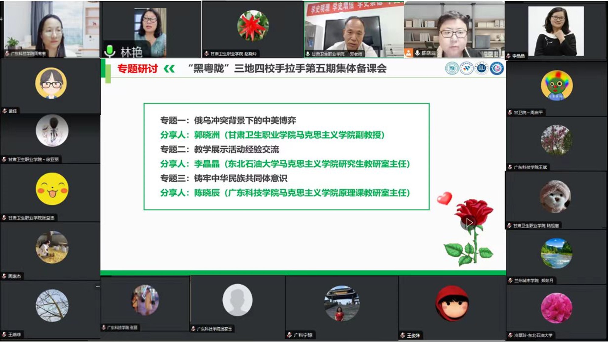 为进一步提升我校思政课教学质量,加强兄弟院校间的交流学习。6月18日晚,世界杯网络平台马院与东北石油大学马院、广东科技学院马院、兰州城市学院马院联合开展“黑粤陇”三地四校手拉手第五期集体备课会活动。