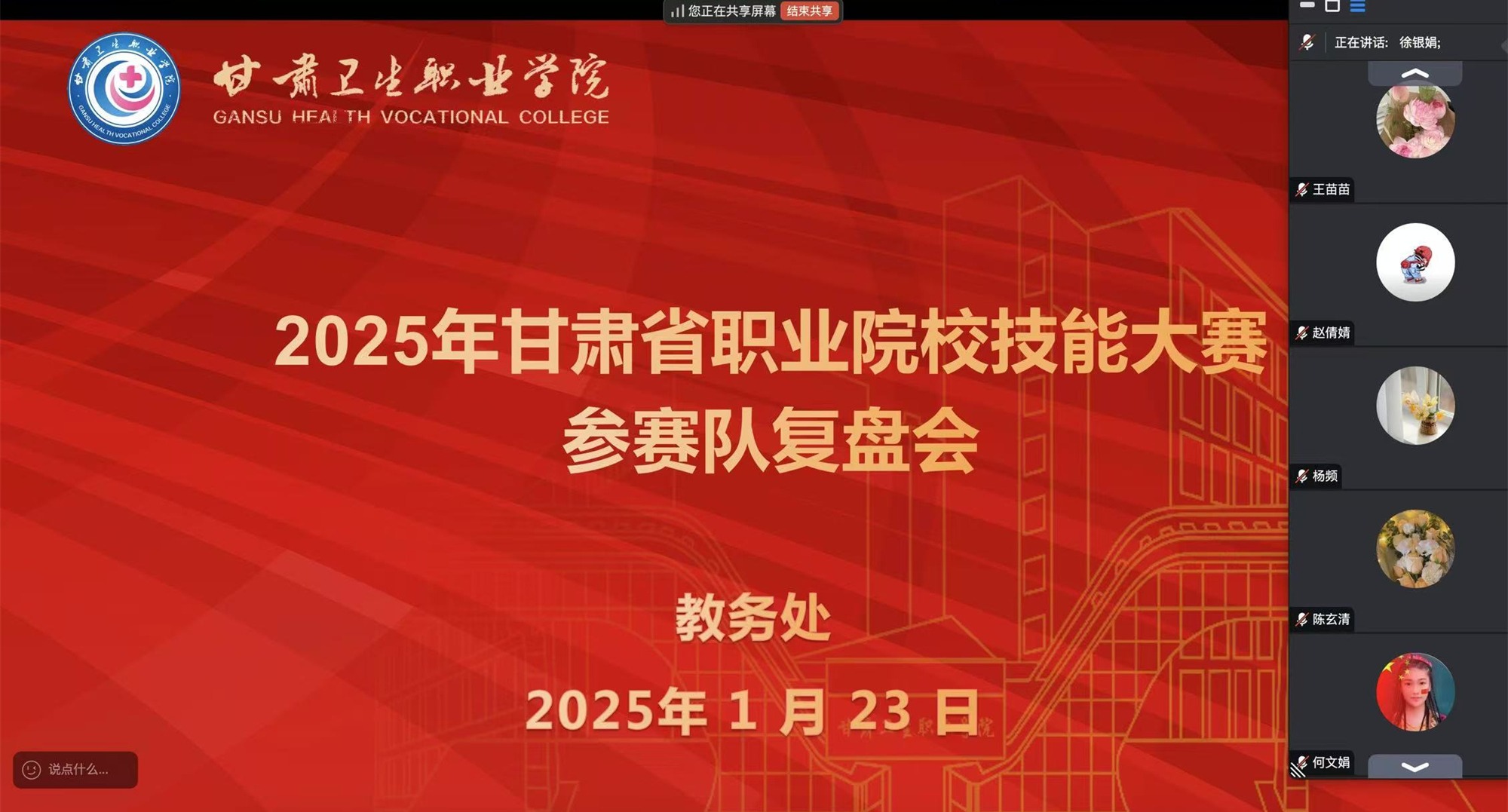 云端聚智谋提升,复盘启新向未来。为深度挖掘技能大赛实战经验,精准定位备赛、参赛过程中的问题,全方位提升学校在职业院校技能大赛中的综合竞争力,1月23日下午,教务处通过腾讯会议平台组织召开了2025年甘肃省职业院校技能大赛参赛队复盘会。副校长杨频,临床医学院、护理学院、药学院、世界杯在线信誉网址和公共基础部院长(部长)、副院长(副部长)、赛项领队、参赛队指导教师、教务处相关工作人员共72人参会。