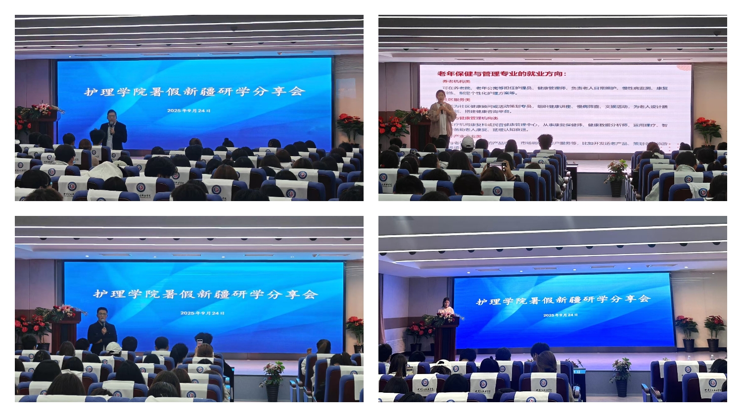 9月24日,护理学院在南丁楼5楼多功能报告厅举办了暑期新疆研学分享会,学院班子成员、辅导员代表、老年保健与管理专业的学生共计227人参与分享会。