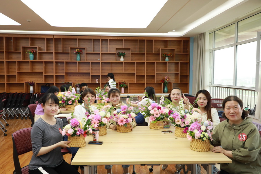 活动开始,花艺老师向教师们介绍了各类花材的特点和花语寓意,对插花的基本方法、花型设计、可以表达的情绪等进行了详细讲解,并结合理论知识现场演示插花技巧。随后,参与教师们在花艺老师的指导下发挥创造力,施展插花技能,一起制作属于自己的暖意花香,随着时间的流逝,一件件春意盎然、生机蓬勃的的插花作品随即盛开在教师们的手中,完成作品后,大家共同分享了花束背后的故事,亦或是此时此刻的心情状态,并为他人写下暖心寄语。活动最后,心理健康教育中心主任丁月娥总结,参与教师手捧自己亲手制作的美丽花篮合影留念,为生活增添靓丽色彩。