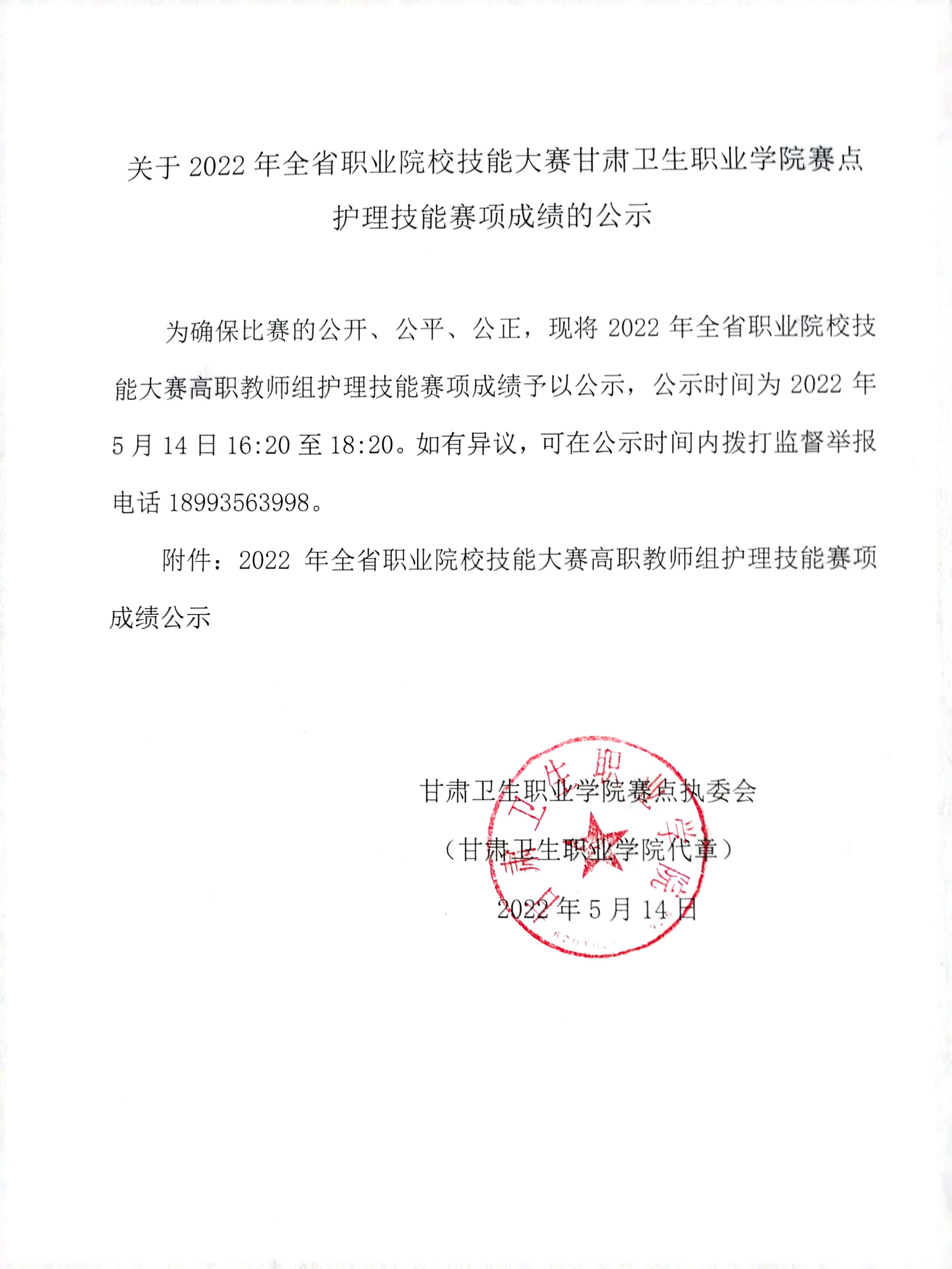 关于2022年全省职业院校技能大赛世界杯网络平台赛点护理技能赛项成绩的公示