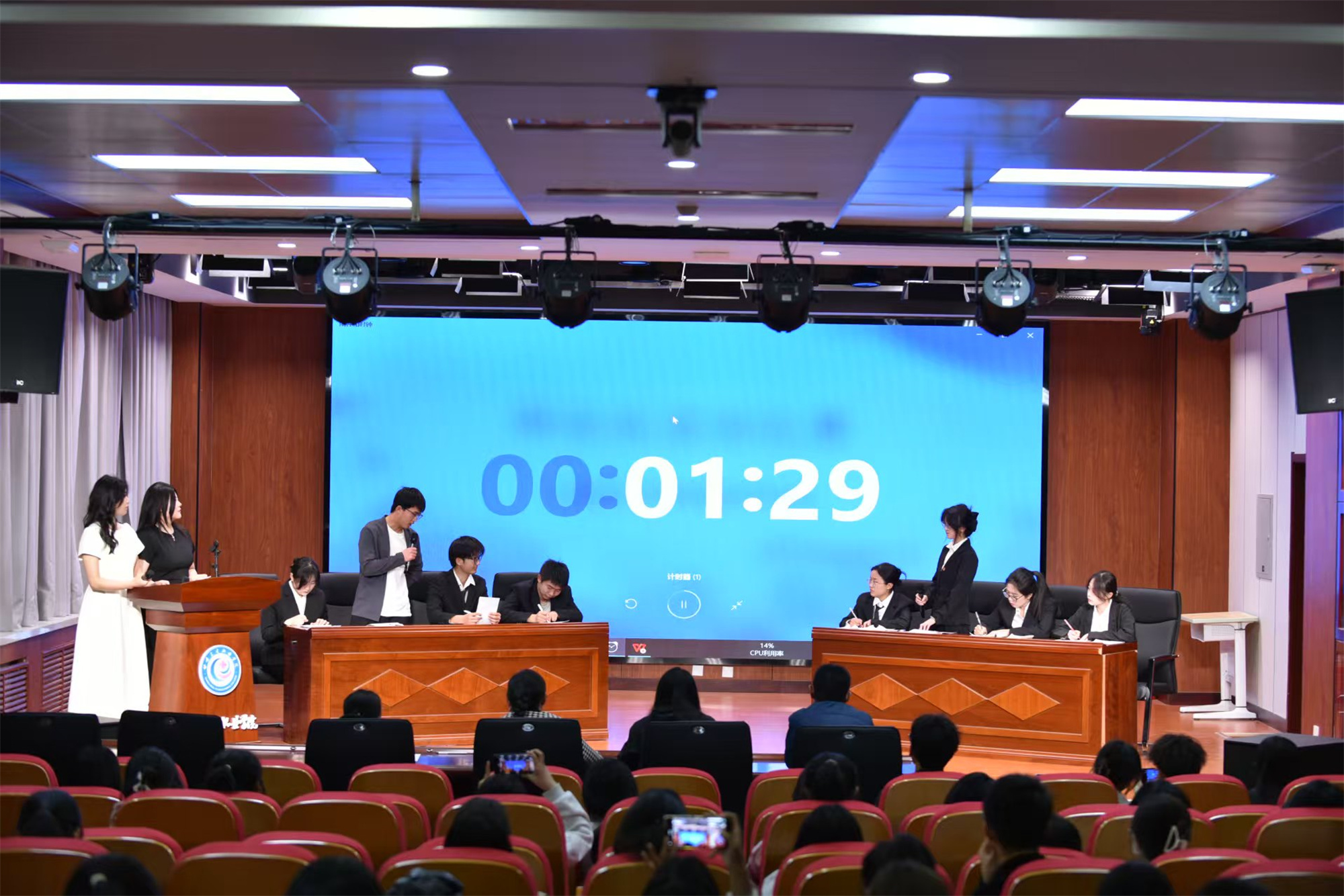 辩论赛围绕文明乘梯礼仪展开,设置“开篇立论、攻辩、攻辩小结、自由辩论、总结陈词”五个环节。正方辩手从“时间管理”和“便利性”角度出发,强调电梯能提高学习效率,认为搭乘电梯比走楼梯好处多。反方则聚焦“环保”与“健康”,认为大学生应少搭电梯、多走楼梯。在攻辩和自由辩论环节,双方辩手针锋相对,凭借敏捷的思维和出色的应变能力,对对方观点进行有力反驳,同时巧妙捍卫己方立场。精彩的辩论引发台下观众的强烈共鸣,现场掌声和欢呼声此起彼伏。