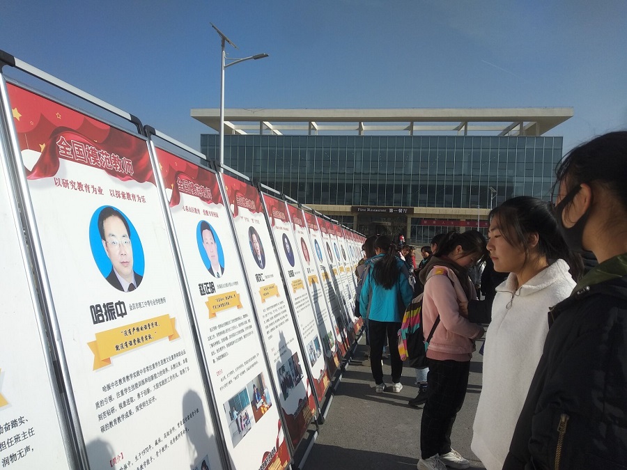 11月18日-19日, 甘肃省教育厅主办的甘肃省优秀教师先进事迹巡展在学校体育馆门前举行。为深入宣传陇原优秀教师的先进事迹,大力弘扬新时代尊师风尚,发挥优秀教师的模范榜样作用,教务处组织全校师生对展览进行了参观学习。