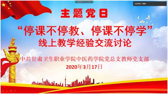 3月17日下午,教师党支部开展主题为“停课不停教,停课不停学”线上教学经验交流主题党日活动,支部全体党员就一周来的线上教学进行了广泛交流,提出存在的问题,分享成功的经验,为后续线上教学工作优质高效开展奠定良好的基础。