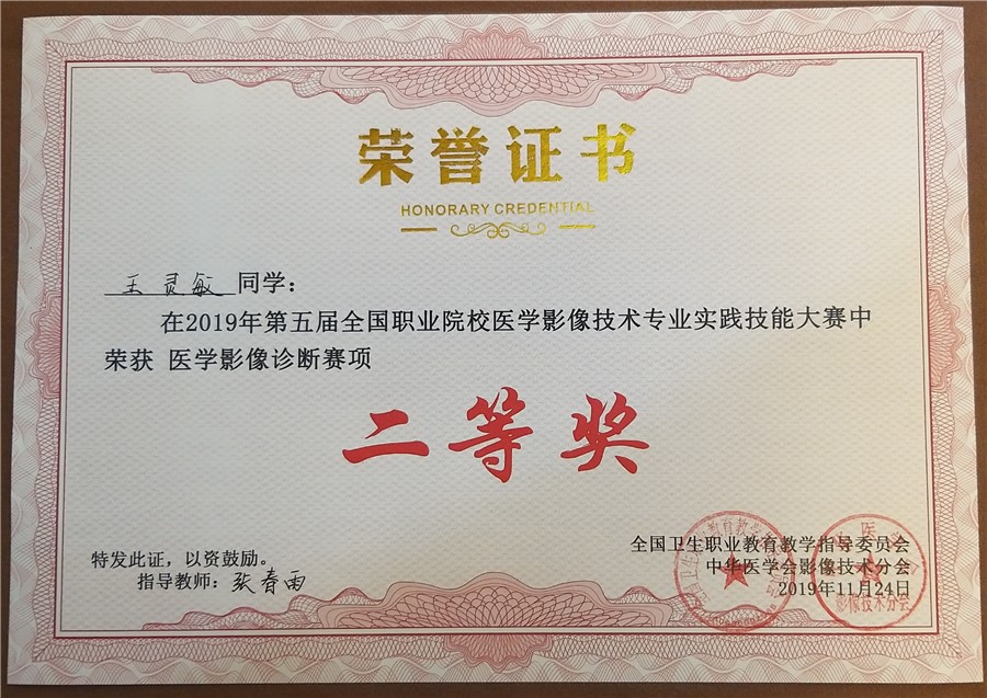 11月22日~25日,由全国卫生职业教育教学指导委员会医学影像技术分委会主办、中华医学会影像技术分会与上海健康医学院医学影像学院协办的“新华医疗杯”第五届全国职业院校医学影像技术专业实践技能大赛在山东淄博举行。来自全国的62所卫生职业院校的248名学生参加了比赛。本次比赛共有DR、CT、超声、影像诊断四个实践技能项目。我校学生王灵敏(指导教师张春雨)在影像诊断项目中获二等奖。
