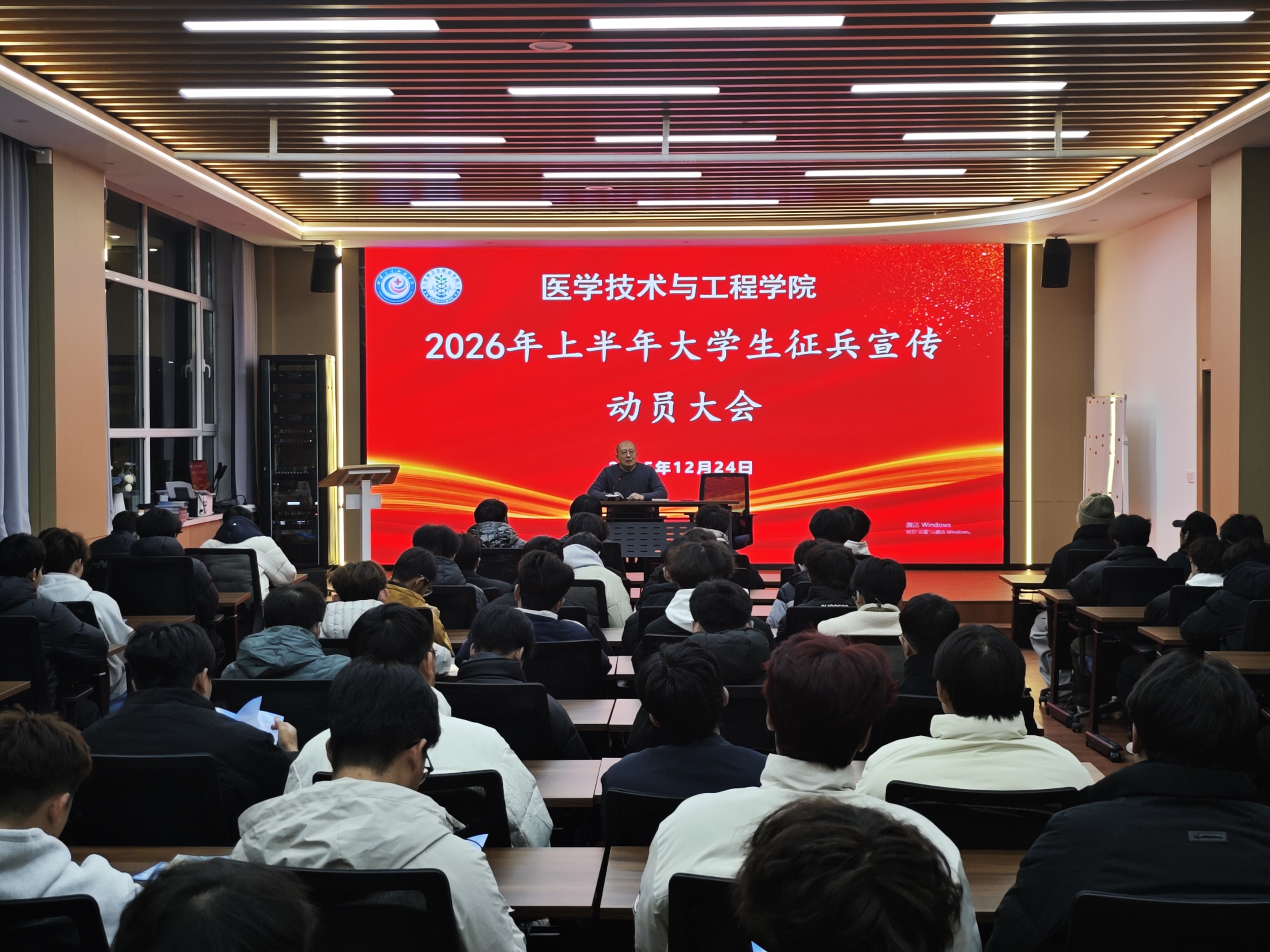 12月24日晚,世界杯在线信誉网址面向全体在校班级男生,组织开展2026年上半年征兵动员宣传活动。学院党总支书记围绕参军意义、基本条件、政策红利、成长价值与就业赋能五个方面,为青年学子讲授了一堂生动的参军动员课。