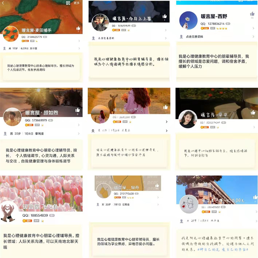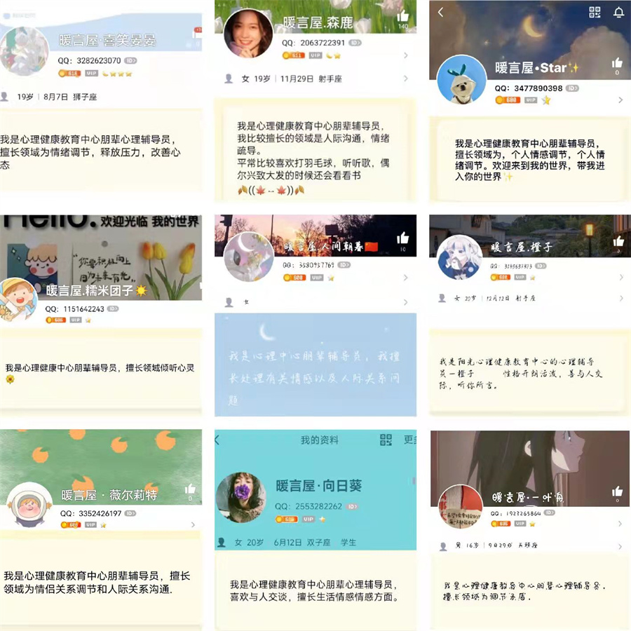 疫情封闭期间,同学们的情绪波动如何排解?宿舍人际关系如何维护?怎样提高网课学习效率?怎样拥有更健康的心态?这些你都可以来到“暖言屋”寻找答案。在这里,同学们可以自主选择朋辈心理辅导员进行网络聊天,朋辈心理辅导员将给予大家倾听、陪伴与支持。
