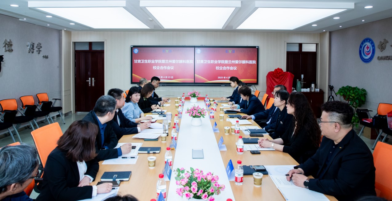 王建成代表学校对兰州爱尔眼科医院一行的到访表示热烈欢迎,介绍了学校的发展历史、办学特色以及眼视光技术专业的现状。盛迅伦介绍了爱尔集团及其医院的概况以及该院在眼科领域的专业优势和取得的成就,范真副院长从“聚焦国策、防控近视”的角度出发,介绍了眼视光的发展方向和合作愿景。校企双方就共建产业学院及现代学徒制试点班、产教融合实训基地建设、人才培养方案修订及课程建设、专业及师资队伍建设等内容进行了深入讨论。