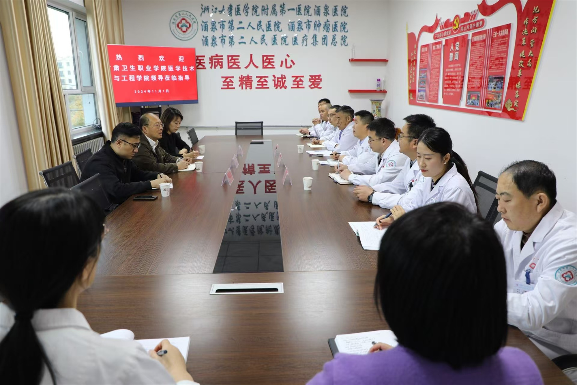 在酒泉市第二人民医院调研过程中,双方通过召开交流座谈会,就医院岗位设置、人才缺口、实习就业、教科研合作等方面议题充分沟通交流,随后实地参观了检验科、放射科、介入放射科、医联体肃州区区域影像诊断中心。