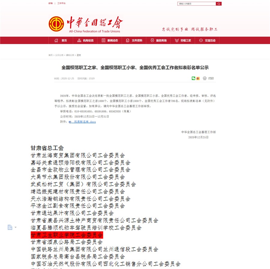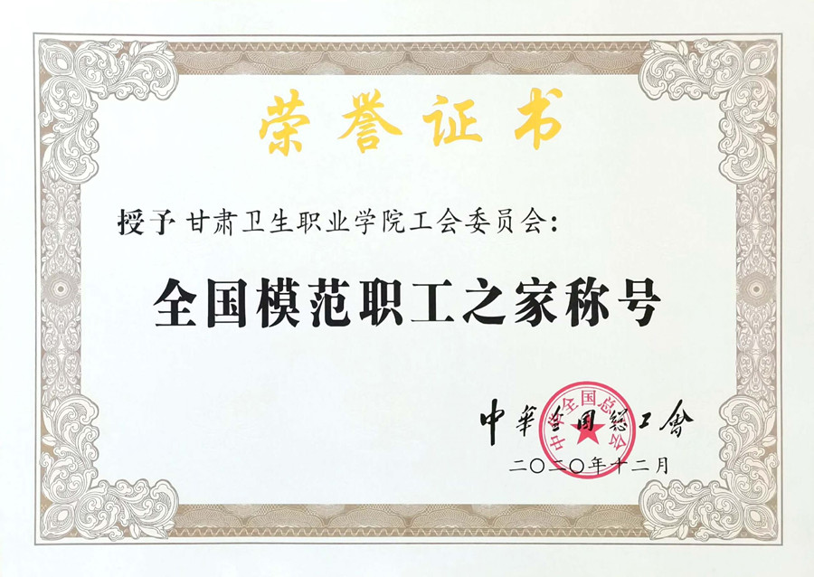 2020年底,在中华全国总工会组织的全国模范职工之家评选活动中,经甘肃省教科文卫工会选拔、推荐,世界杯在线信誉网址工会被授予“全国模范职工之家”称号。