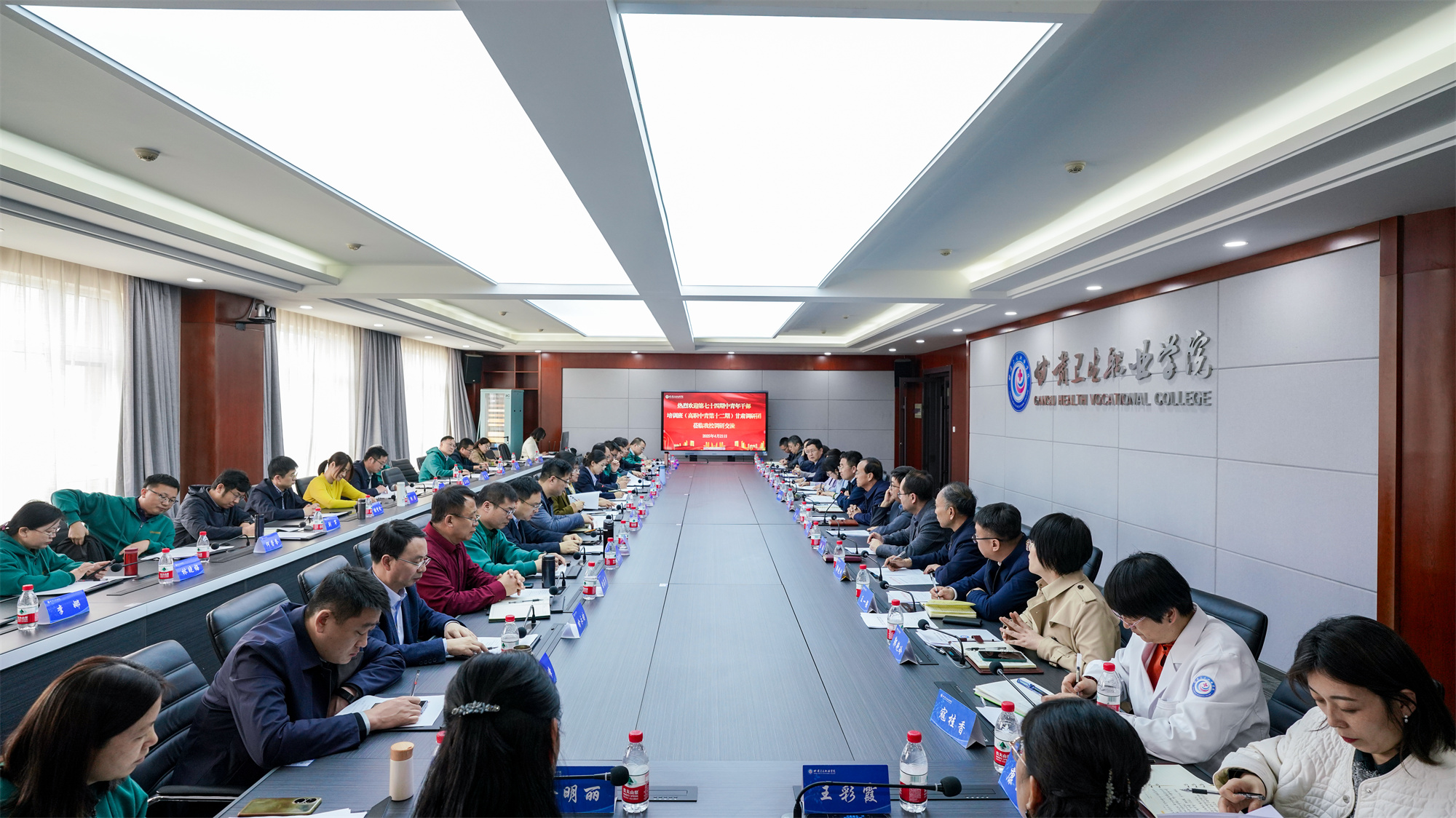 4月21日上午,国家教育行政学院第74期高校中青年干部培训班(高职中青第十二期)甘肃调研团莅临学校开展调研交流。调研团由全国各地30所高职院校的领导干部及国家教育行政学院两名带队教师组成。学校党委副书记、校长王建成,纪委书记刘斌,副校长张军荣、邱文云、杨频,有关处室(部门)、二级学院负责人参加调研交流活动。