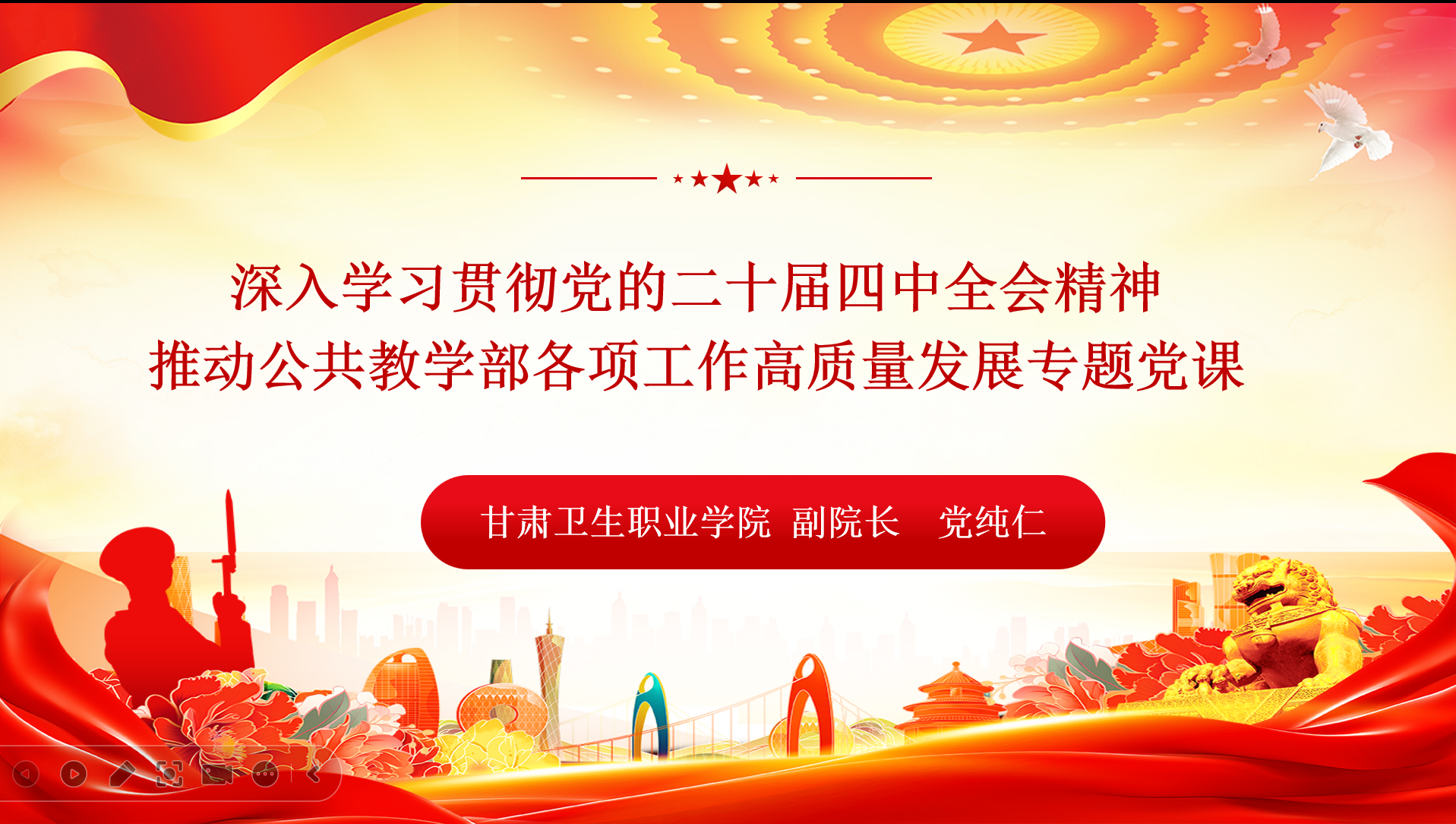 领导干部讲党课环节,党纯仁副校长为全体党员讲授了《深入学习贯彻党的二十届四中全会精神 推动公共教学部各项工作高质量发展》的专题党课。党课内容紧扣主题、脉络清晰,从“阐释重大意义、解读重要部署、立足教学岗位”三个维度进行讲解,要求全体党员深入学习贯彻党的二十届四中全会精神,在新时代新征程上立足公共教学岗位,在课程思政建设、教学改革创新、师资队伍建设等方面主动担当作为,切实把学习成果转化为提升教学质量、服务学生成长的实际行动。
