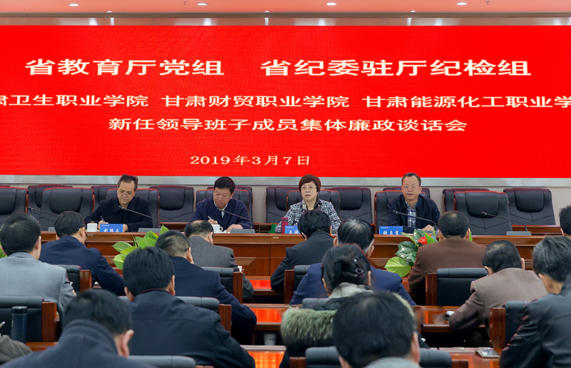 3月7日下午,省教育厅、省纪委驻厅纪检组在我校召开世界杯在线信誉网址、甘肃财贸职业学院、甘肃能源化工职业学院新任领导班子成员集体廉政谈话会。省教育厅党组书记、厅长、省委教育工委书记、兰州新区职教园区管理委员会主任王海燕,省教育厅纪检监察组组长雷江红,省教育厅人事处处长赵振文,省教育厅直属机关党委专职副书记张启有等领导出席会议,三所院校新任领导班子全体成员参加会议。谈话会由雷江红主持。