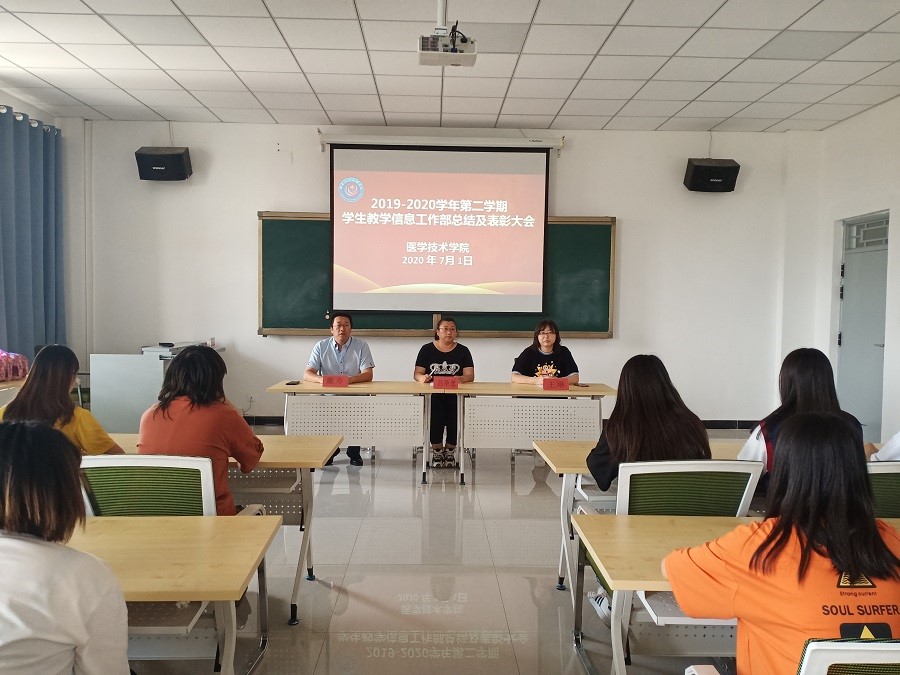 医学技术学院学生教学信息工作部在日常教学管理中担任着了解、收集课堂教学信息的职责,对完善学院教学质量监控体系,提高教学质量发挥了积极作用。为总结2019-2020学年学生教学信息工作部的工作,表彰做出优秀工作的同学,根据《医学技术学院学生教学信息员工作细则》精神,学院于2020年7月1日下午在学院会议室召开了学生教学信息工作总结及表彰会议。学院副院长吕荣光、教务工作办公室主任董方、实验实训教学办公室主任王琳及教学信息工作部教学信息员40余人参加了会议,会议由吕荣光主持。
