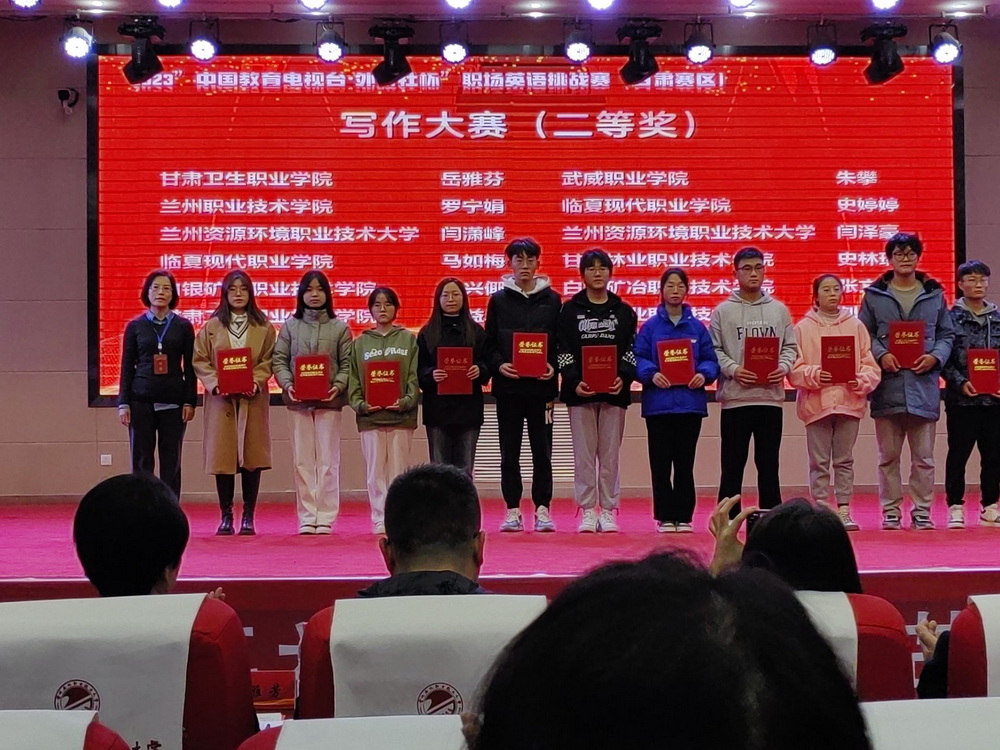 11月5日,2023年“中国教育电视台·外研社杯”职场英语挑战赛(甘肃赛区复赛)由中国教育电视台和外语教学与研究出版社联合主办、兰州石化职业技术大学承办的甘肃赛区复赛,包括演讲、写作两项赛事。演讲大赛分为主题演讲和即兴演讲两个环节。参赛选手围绕大赛主题演讲题目“Great Aspiration,Great Us”进行3分钟英语演讲,排名前60%的选手进入复赛即兴演讲和回答问题环节。选手们激情澎湃地演讲中创新与技巧并存,彰显出智慧的灵动和思想的升华,将大赛现场氛围逐步推向高潮。在演讲比赛中,我校学生王精精(护理专业)、王瑞丽(中医专业)获二等奖,王丽娟、杨爱萍老师分别获二等奖优秀指导教师;祁莹莹(中医专业)获三等奖,保静老师获三等奖优秀指导教师。写作比赛紧跟时代形势和经济社会发展需求,紧密贴合职场实际与社会生活,从思维能力、实践能力、创新能力和解决问题的能力等多个维度考查学生的英文书面沟通、跨文化交际、逻辑分析、人文思辨等综合能力及职业素养。在写作比赛中,我校学生岳雅芬(检验专业)获二等奖,傅宏老师获二等奖优秀指导教师奖;杨晓倩(药学专业)、郝秀娟(护理专业)获三等奖,杨爱萍、钱磊老师分别获得三等奖优秀指导教师奖。