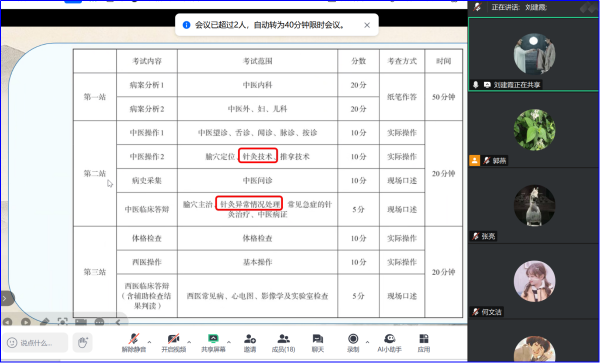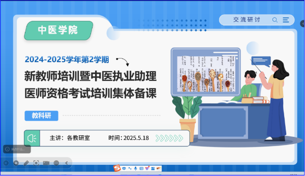 在三个半小时的深度研讨中,年轻教师运用动态PPT与临床案例结合的信息化创新教学手段进行课程展示,将复杂的病案分析转化为生动的临床呈现;中医执业助理医师资格考试备考辅导授课教师通过列表、视频等直观形式梳理考点,配以历年真题大数据分析,深入剖析考纲要求体系及难点,毫无保留地分享高效备考辅导技巧,充分展现出扎实的专业功底和积极创新的教学态度。教学展示全程采用互动模式,主屏共享呈现课件,音频视频实时点评,加深交流研讨临场感。
