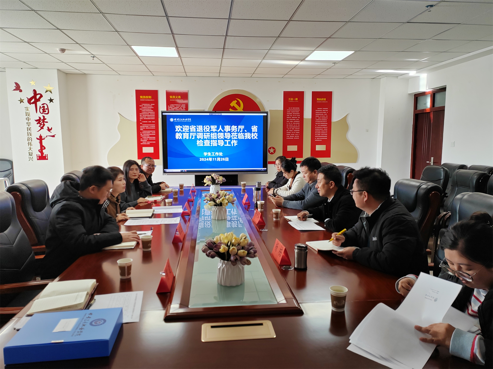 2024年11月26日上午,为全面了解自主就业退役士兵学生身份审核认定及享受学费减免和国家助学金等政策的落实情况,省退役军人事务厅就业创业处干部严利军、兰州交通大学学生处教育管理科科长杨栋、天水市退役军人事务局就业创业科科长蒲宝鹏一行莅临我校进行调研指导。