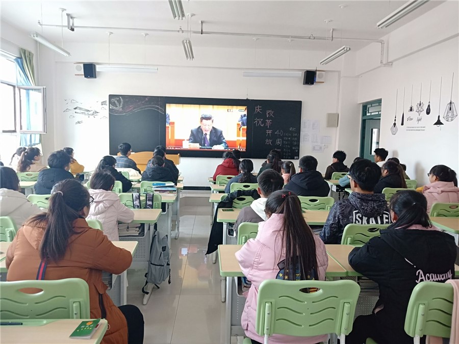 12月18日下午,校团委组织全校130余个团支部5000余名学生分别在各自教室收看了“庆祝改革开放40周年大会”直播,认真学习领会习近平总书记的重要讲话精神,共同回顾、感受改革开放给人们生活带来的巨大变化。