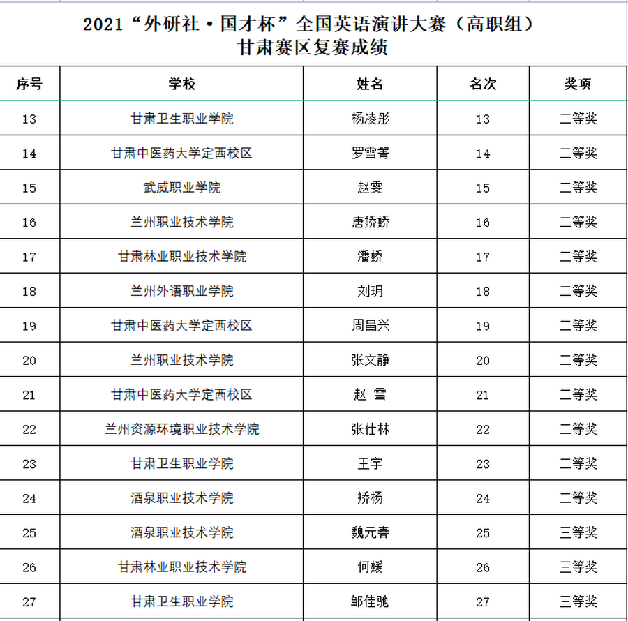 11月7日,2021年“FLTRP·ETIC Cup”世界杯网络平台 Public Speaking Contest由甘肃省教育厅、甘肃省大学外语教学研究会、外语教学与研究出版社主办,兰州外语职业学院承办,大赛以“Red Star Over China”《红星照耀中国》主题演讲,以激励青年学子学史力行、砥砺奋斗,用外语讲好中国故事、传播中国好声音。我校2020级临床三年制15班杨凌彤(指导教师保静)、2018级护理五年制18班王宇(指导教师王丽娟)、2020级康复治疗技术三年制4班邹佳驰(指导教师高小静)代表学校参加甘肃赛区(高职组)线上复赛,经过激烈角逐分别获得两个二等奖、一个三等奖。