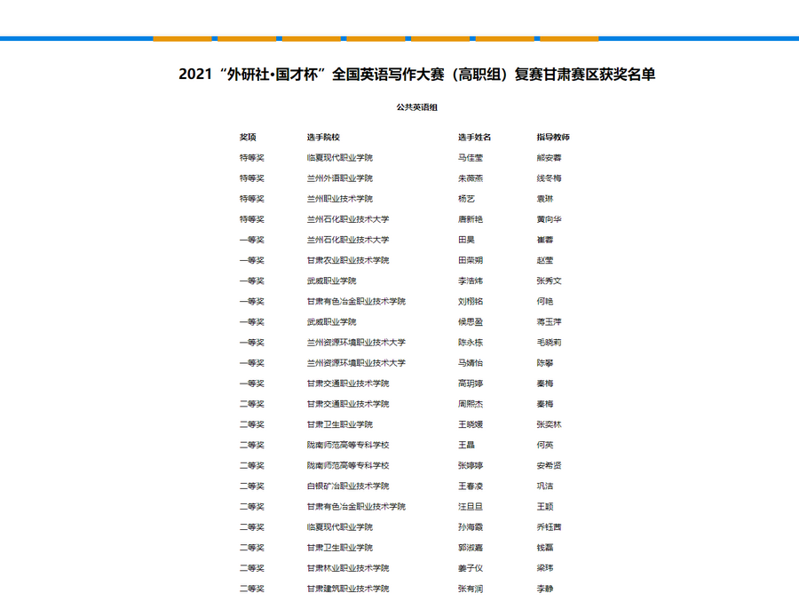 10月31日,2021“外研社·国才杯”全国英语写作大赛的复赛由甘肃省教育厅、甘肃省大学外语教学研究会、外语教学与研究出版社主办,兰州石化职业技术大学承办的比赛由看视频写作、看图表写作及看短文写作三个部分组成,通过“iTEST客户端”完成。我校2020级护理三年制72班王晓媛(指导教师张奕林)、2020级针推17班郭淑嘉(指导教师钱磊)积极参加甘肃赛区(高职组)线上复赛,两人喜获二等奖。