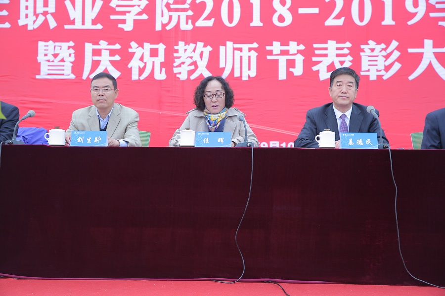 大会在庄严肃穆的升国旗仪式中开场。任晖院长在大会上致辞,她代表学院领导向满怀理想抱负选择了学院的3500名新生表示衷心的祝贺和热烈的欢迎,向默默耕耘、无私奉献、恪尽职守的全校教职员工致以节日的问候和美好的祝福,向受到表彰的先进集体和个人表示热烈的祝贺。在庆祝第34个教师节之时,任晖院长对全体教师提出三点希望:一是要追求理想,做好本职工作;二是要潜心教学,服务社会发展;三是要关爱学生,甘为良师益友。同时,她将“道德”、“励志”、“追求”、“担当” 、“勤学”5个关键词送给全体新生,表达出对同学们的殷切期望。