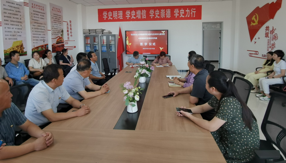 为庆祝中国共产党成立102周年华诞,全面学习贯彻习近平新时代中国特色社会主义思想,努力构建“各自发力、优势互补、互相促进、共同提高”的党建工作新格局。6月30日上午,马克思主义学院教师党支部与兰州市七里河区中医医院党支部30多名党员在马克思主义学院503党员活动室开展了“党建结对聚合力 携手共进促发展”的主题党日活动。