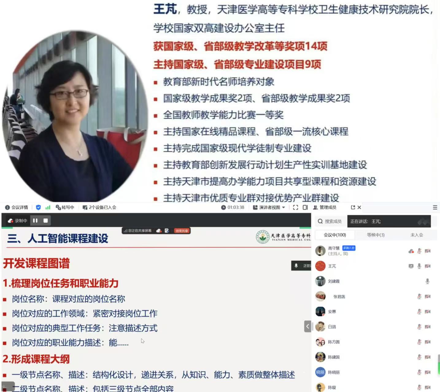 本次培训精准对接当前课程建设核心需求,特邀天津医学高等专科学校王芃教授作专题分享。作为国家级在线精品课程负责人、全国教师教学能力比赛一等奖获得者,王芃教授以“人工智能赋能课程建设与改革”为主题,系统阐述了课程图谱构建方法,展示了如何将新技术、新标准、新规范融入课程内容,同时结合课程建设实例,分享了课程模块化设计与课程思政有机融合的实践经验。