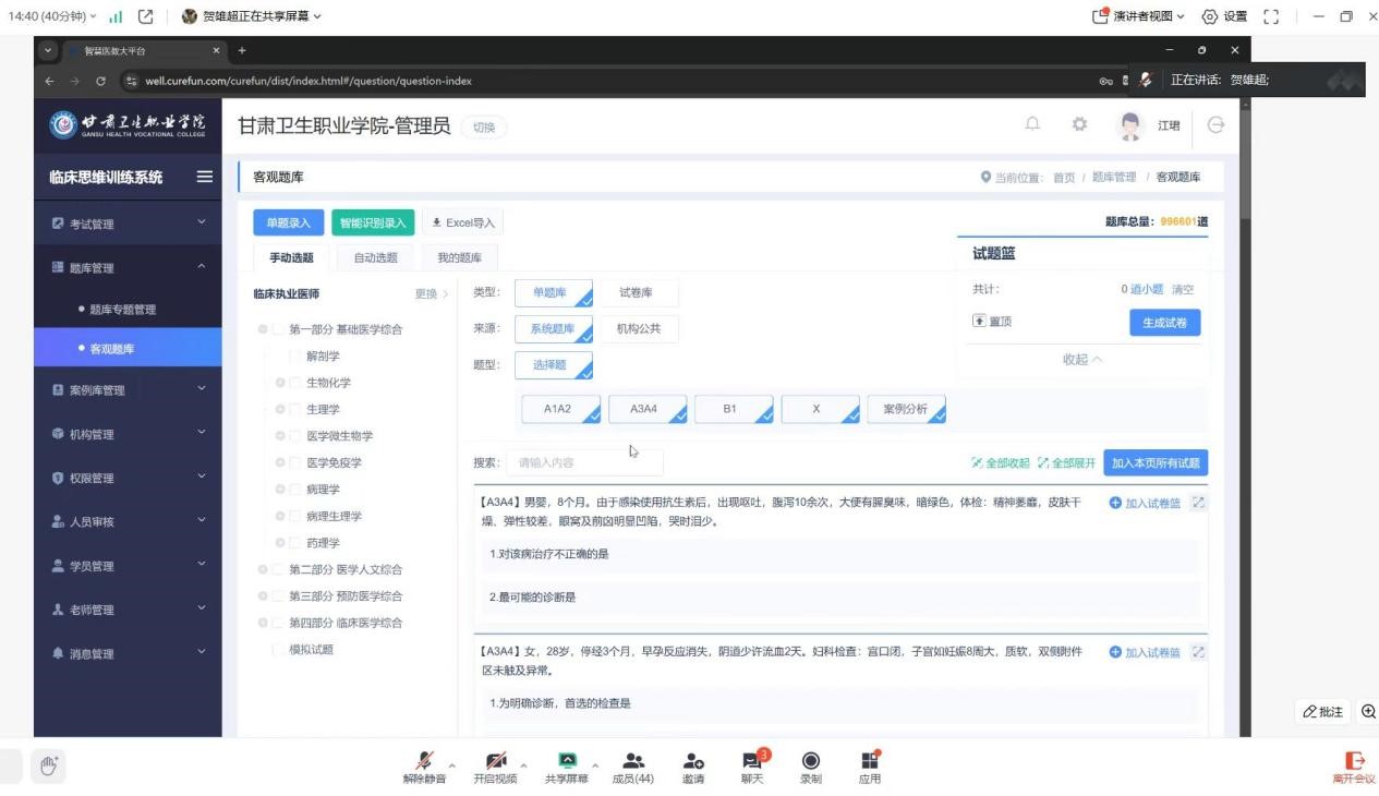 培训中,技术人员详细介绍了平台题库的设置与种类,涵盖了临床医学各学科的知识点,并演示了题库导入、试卷生成、考试创建及评分等操作流程,现场解答了教师们的疑问。