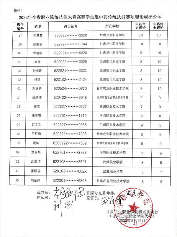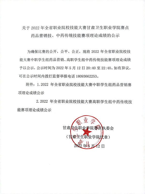 关于2022年全省职业院校技能大赛世界杯网络平台赛点药品营销技能、中药传统技能赛项理论成绩的公示