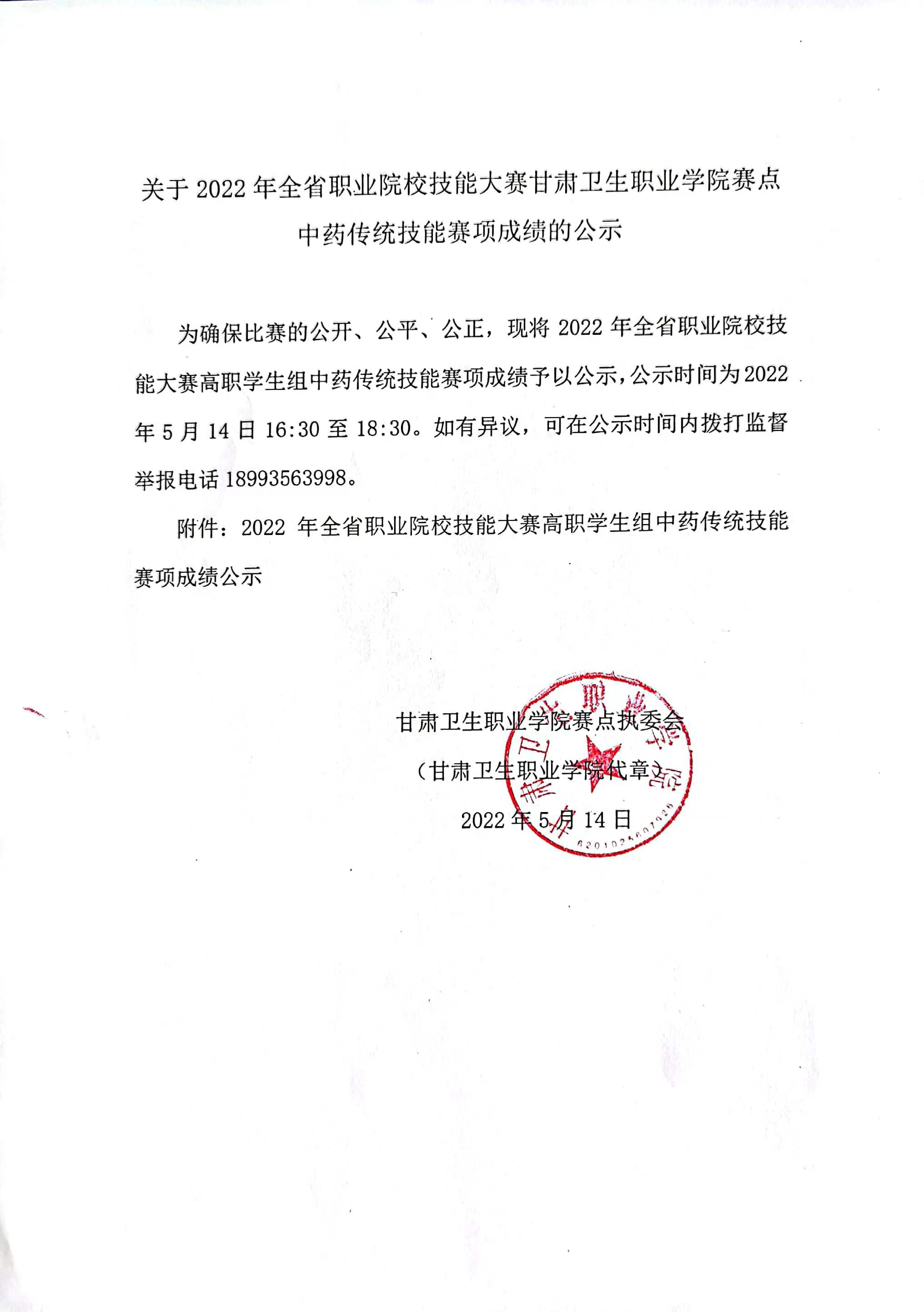 关于2022年全省职业院校技能大赛世界杯网络平台赛点中药传统技能赛项成绩的公示