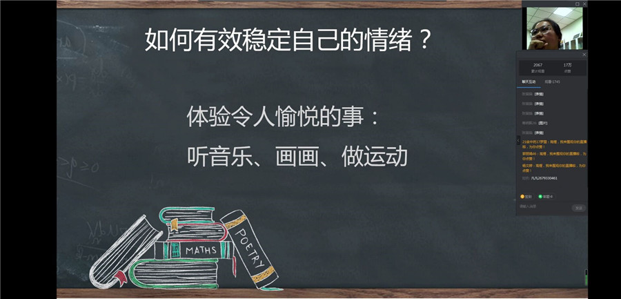 中心教师以丰富详实的案例向大家讲述了面对疫情,要重视可能出现的焦虑、恐惧、多疑、愤怒、盲目乐观等心理问题,并分析其产生的原因,传授了数十条有效稳定情绪的方法,供同学们选择体验,提供心理防疫助力。在分享调节情绪的诸多方法时,主讲教师各有侧重:丁月娥主任重点推荐了养心手动操;高煜老师和同学们共同分享了感兴趣的书籍和网络节目;张瑞荣老师带领同学们体验了身心放松训练。中心教师希望提供诸策略,协助同学们稳定情绪。讲座布置课后小作业,旨在帮助同学们巩固学习内容,增强信心,更加从容应对疫情。