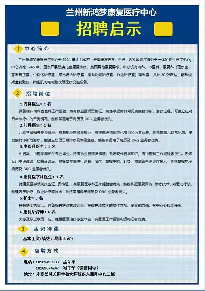 兰州新鸿梦康复医疗中心招聘启事