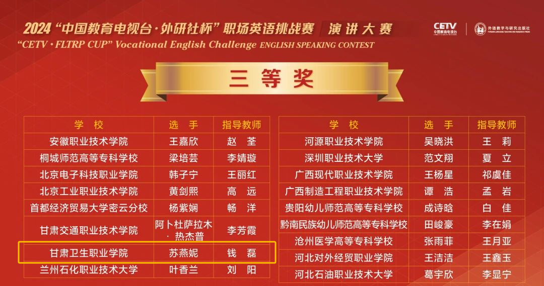 由中国职业技术教育学会指导,中国教育电视台、外语教学与研究出版社联合主办的2024“中国教育电视台·外研社杯”职场英语挑战赛写作大赛和演讲大赛全国决赛在12月8日、12日成功举办。我校学生张倩蓉获得写作大赛全国一等奖,苏燕妮获得演讲大赛全国三等奖。高小静和钱磊分别获得指导教师一等奖和三等奖。