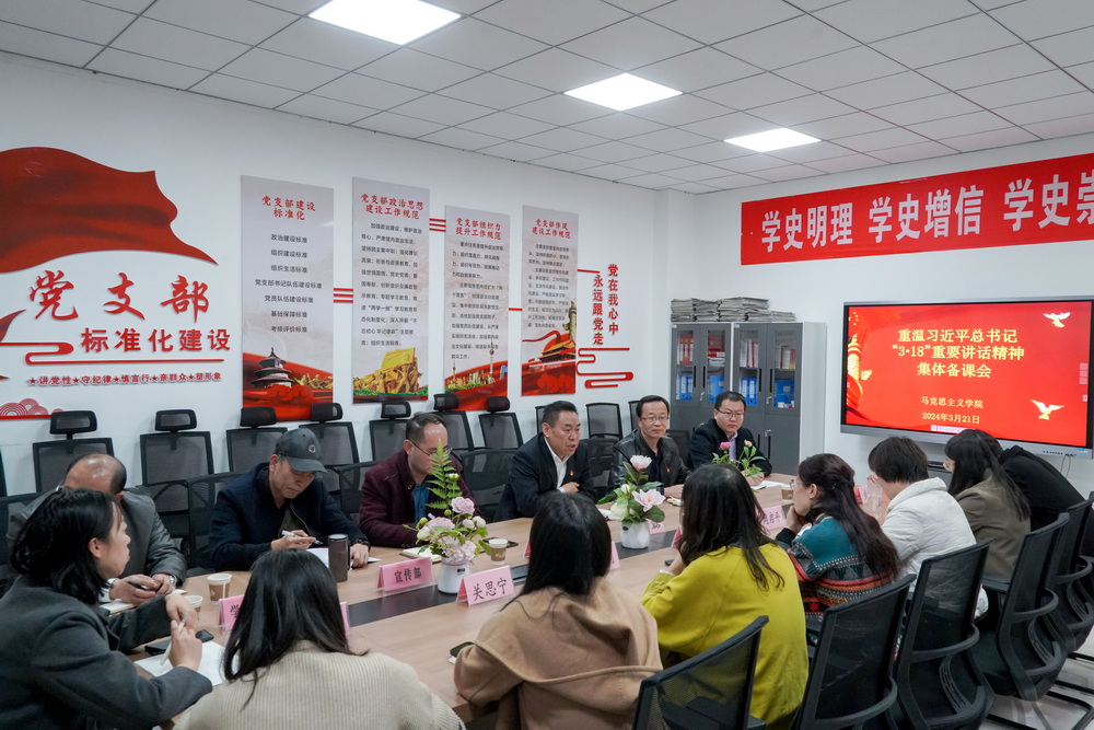 包磊强调,要深入学习领会习近平总书记“3·18”重要讲话的重大意义,全面把握内涵要求,在实践中全面贯彻落实“六个要”和“八个相统一”要求,进一步加强“育人共同体”建设,构建“大思政”育人格局。一是要提高政治站位,深刻认识马克思主义学院建设的重要性,牢牢把握马克思主义学院的政治属性,强化“马院姓马、在马言马”的鲜明导向和办学原则,切实做好铸魂育人的工作。二是要持续加强课程建设,进一步落实教学管理、集体备课和听课指导等制度,推进思政课提质增效。三是要高度重视思政课教师队伍建设,进一步加强对教师配备、学历提升、职称评审、学习培训、实践研修等方面支持和保障。四是要加强马克思主义理论科学研究,加强科研团队建设,做好各级各类科研项目申报,一体化推进教学科研工作。五是要加强合作交流,积极推进与省内重点高校马克思主义学院合作共建,搭建共享平台,借助优势带动,推动共赢发展。六是依托红色文化教育实践基地,把红色资源利用好、把红色传统发扬好、把红色基因传承好,让红色文化释放更大的感召力。