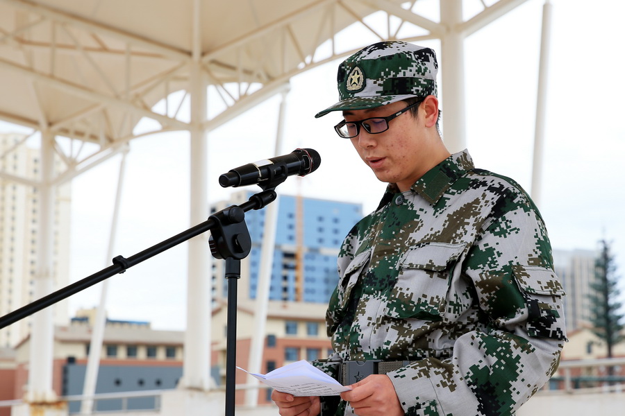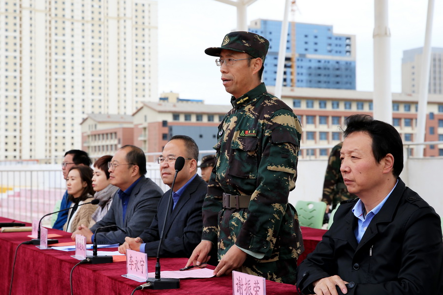 康逢民副校长发表动员讲话,他对承担本次军训任务的部队官兵表示热烈欢迎,并诚挚感谢他们对我校军训工作给予的大力支持。他强调,学校开展军事训练是《国防教育法》规定的一项重要任务,是学生在校期间接受国防教育,树立集体主义、爱国主义精神教育的一个基本形式,也是增强学生组织观念,培养艰苦奋斗作风的重要途径。同时他对参训同学们提出三点希望:一是要有吃苦的准备,思想上高标准、严要求,要有战胜困难的信心,不怕苦、不怕累,刻苦训练;二是行动上服从指挥,一切行动听指挥,培养良好的集体责任感和荣誉感;三是训练中确保安全,并呼吁各位教职员工积极为参训学生做好服务工作。