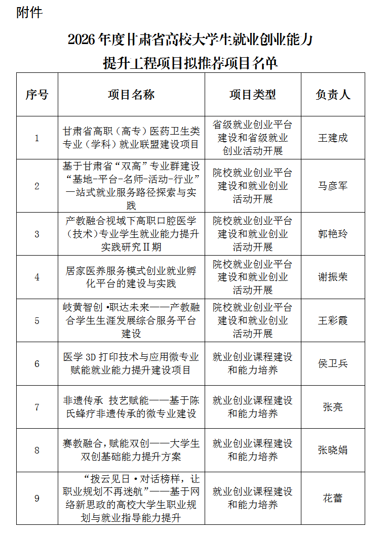 关于2026年度甘肃省高校大学生就业创业能力提升工程项目学校拟推荐项目的公示