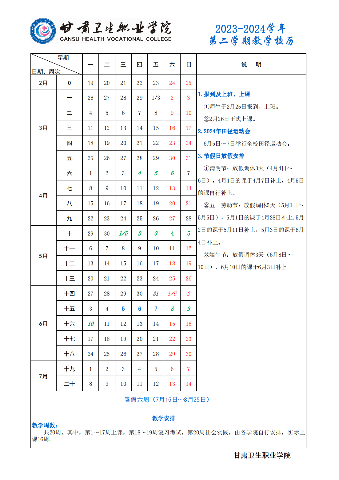世界杯在线信誉网址2023-2024学年第二学期教学校历